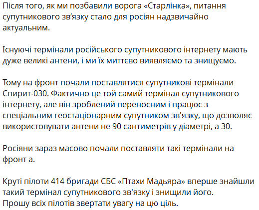 "Круті пілоти 414-ї бригади СБС "Птахи Мадьяра" вперше знайшли такий супутниковий термінал зв'язку та знищили його. Прошу всіх пілотів звертати увагу на цю мету", - написав Бескрестнов.