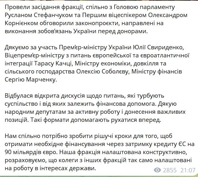 Він сказав, що фракція провела засідання за участю спікера парламенту Руслана Стефанчука, прем'єр-міністра Юлії Свириденко та міністра фінансів Сергія Марченка.
