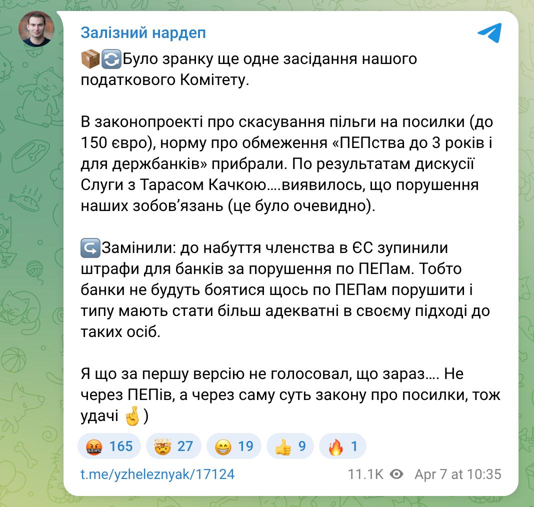 "За результатами дискусії "Слуги" з Тарасом Качкою… виявилося, що це порушення наших зобов'язань (це було очевидно). Замінили: до набуття членства в ЄС зупинили штрафи для банків за порушення по PEP. Тобто банки не боятимуться будь-що по PEP порушити і типу повинні стати більш адекватними у своєму підході до таких осіб", - написав Железняк.