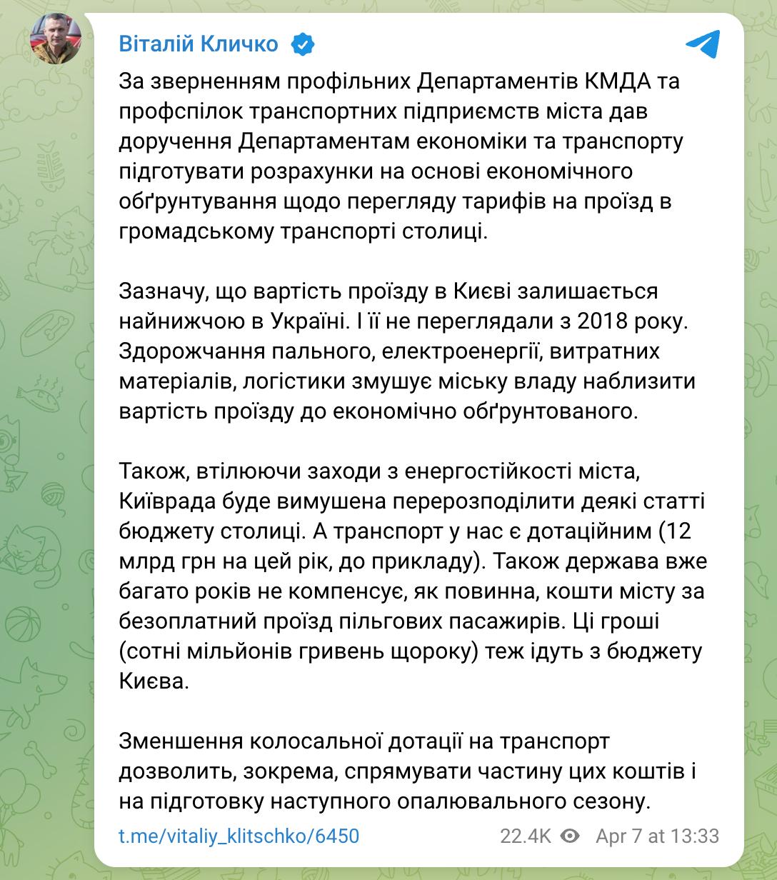 "Подорожчання пального, електроенергії, витратних матеріалів, логістики змушує міську владу наблизити вартість проїзду до економічно обґрунтованого", - написав Кличко.