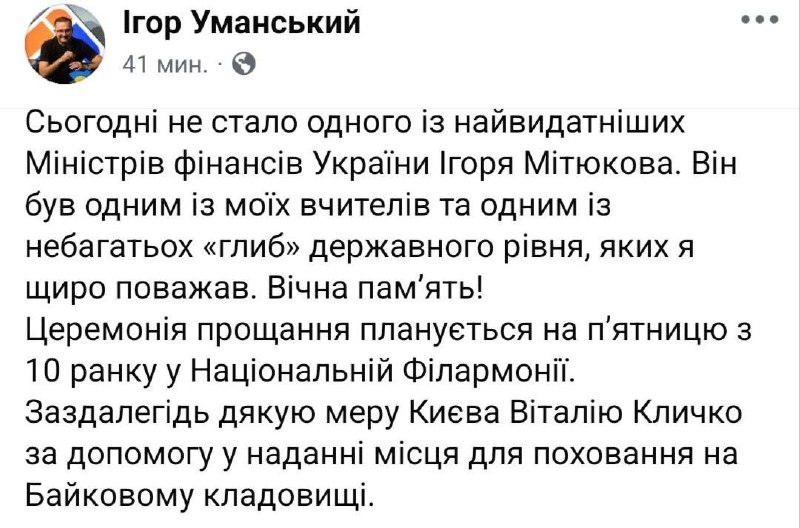 "Сьогодні не стало одного з найбільших міністрів фінансів України Ігоря Мітюкова. Він був одним із моїх вчителів та одним із небагатьох брил державного рівня, яких я щиро поважав. Вічна пам'ять! Церемонія прощання планується у п'ятницю з 10 ранку у Національній філармонії", - написав він.