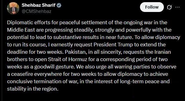 "Щоб дозволити дипломатії виконати свою роботу, я щиро прошу президента Трампа продовжити термін на два тижні. Пакистан з усією щирістю просить іранських братів відкрити Ормузьку протоку на відповідний період у два тижні як жест доброї волі. Ми також закликаємо всі воюючі сторони дотримуватися припинення вогню. остаточного припинення війни на користь довгострокового миру та стабільності в регіоні", - заявив Шариф.