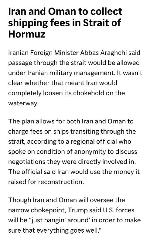 У свою чергу Associated Press з посиланням на чиновника, знайомого з перебігом переговорів між США та Іраном, повідомляє, що Іран продовжить брати гроші з суден, що йдуть через Ормузьку протоку. Також власники судів платитимуть і Оману.