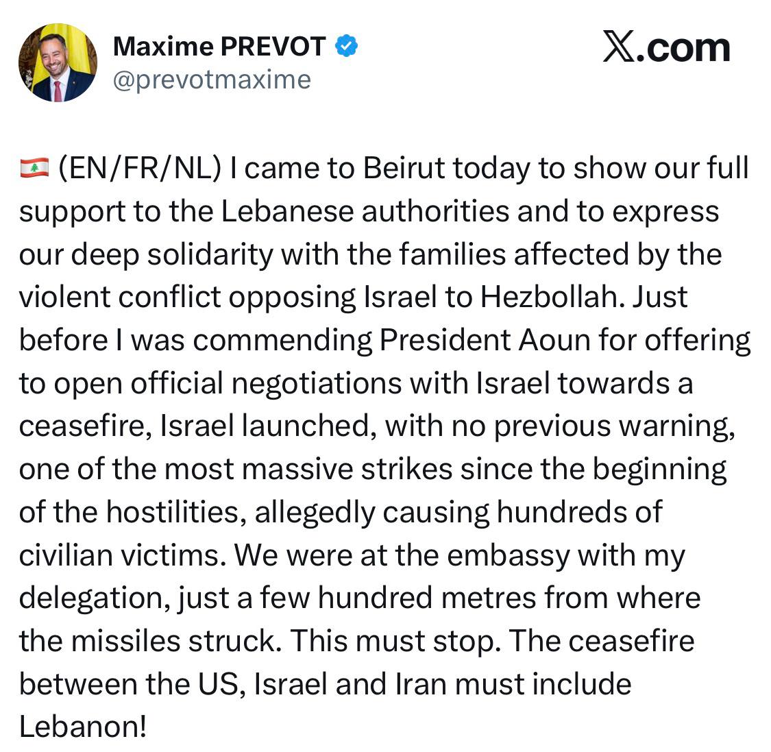"Сьогодні я прибув до Бейруту, щоб висловити нашу повну підтримку ліванській владі і глибоку солідарність з сім'ями, які постраждали від жорстокого конфлікту між Ізраїлем і "Хезболлою". Незадовго до того, як я висловив подяку президентові Жозефу Ауну за пропозицію почати офіційні Ізраїль без попереднього попередження завдав один із наймасовіших ударів з початку бойових дій, імовірно, що спричинив за собою сотні жертв серед цивільного населення. – написав Прево.