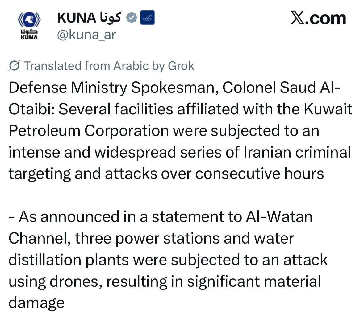 Представник Міністерства оборони, полковник Сауд аль-Отайбі заявив, що кілька об'єктів, пов'язаних з Kuwait Petroleum Corporation, зазнали інтенсивних і масштабних атак з боку Ірану, які тривали кілька годин поспіль.