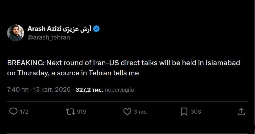 "Джерело в Тегерані повідомив мені, що наступний раунд прямих переговорів Ірану та США пройде в Ісламабаді в четвер", - написав він.