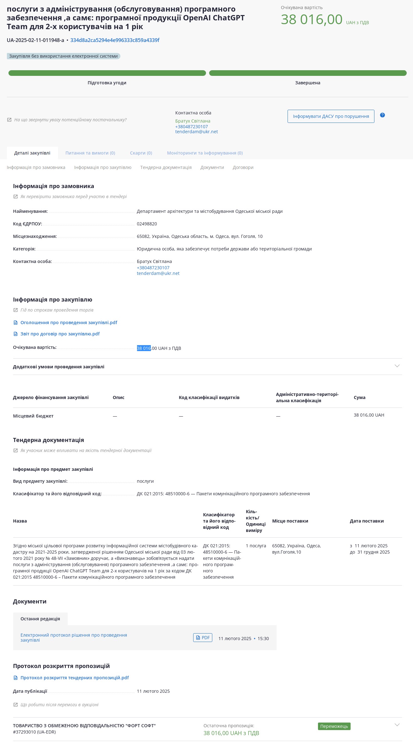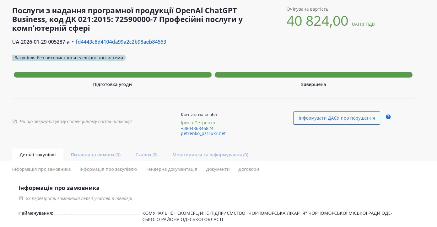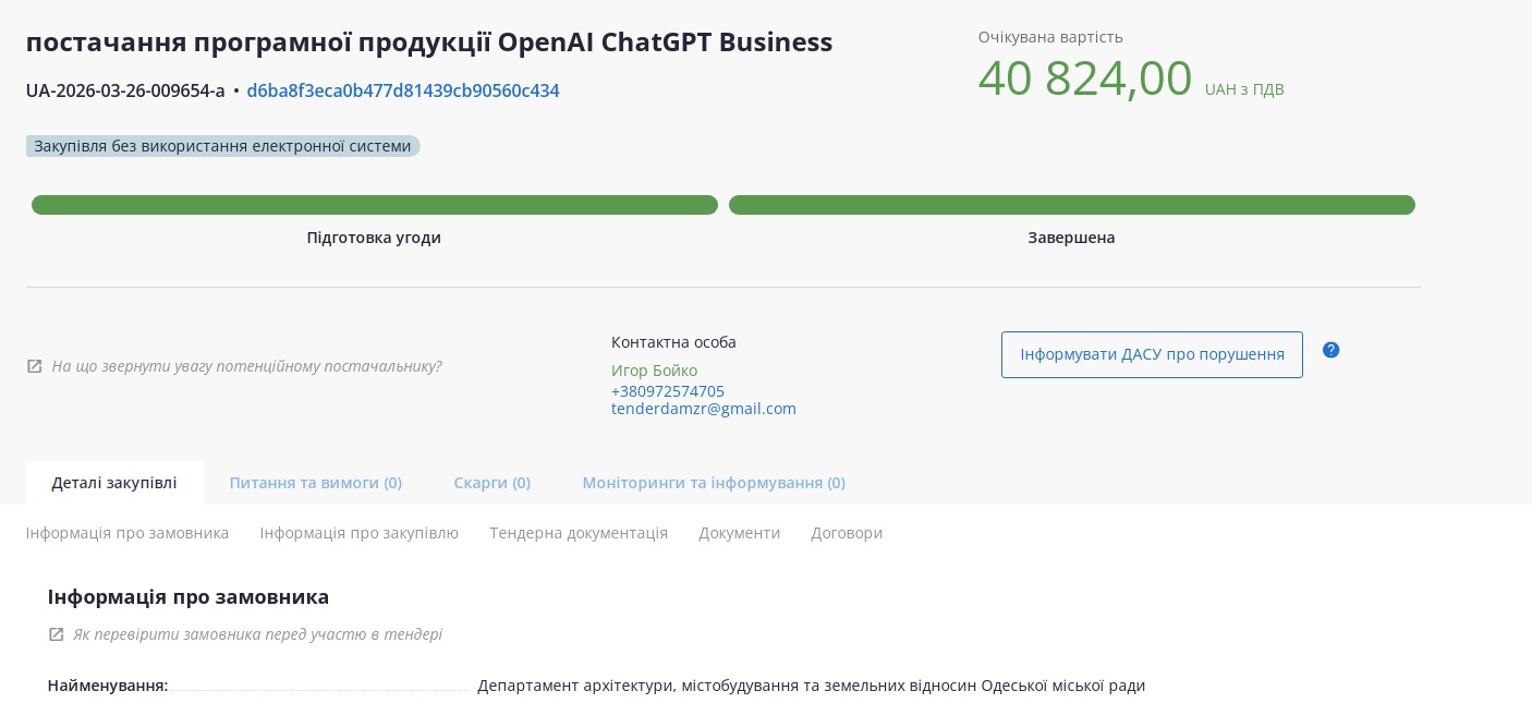 Через рік, 26 березня, департамент опублікував тендер на постачання програмної продукції OpenAI ChatGPT Business вже на 40 824 гривні. Його виграла та сама компанія