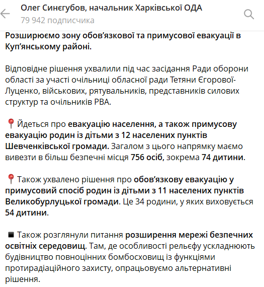 Синегубов додав, що було ухвалено рішення і про обов'язкову примусову евакуацію сімей з дітьми з 11 населених пунктів Великобурлуцької громади. Це 34 сім'ї, в яких виховуються 54 дитини.