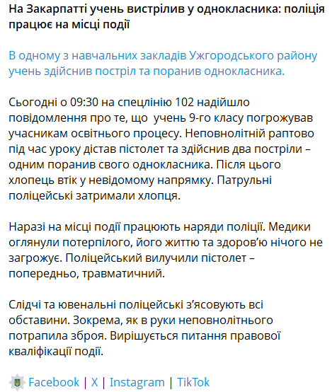 "Сьогодні о 09:30 на спецлінію 102 надійшло повідомлення про те, що учень 9-го класу погрожував учасникам освітнього процесу. Неповнолітній раптово під час уроку дістав пістолет і зробив два постріли, одним поранив свого однокласника. Після цього хлопець втік у невідомому напрямку. Патрульні поліцейські затримали його", - розповіли у поліції.
