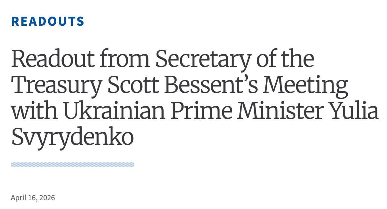 "Міністр Бессент подякував прем'єр-міністру Юлії Свириденко за динаміку розвитку Фонду інвестицій у відновлення України (URIF), включаючи важливу віху - схвалення у березні першої інвестиції URIF", - йдеться у повідомленні.
