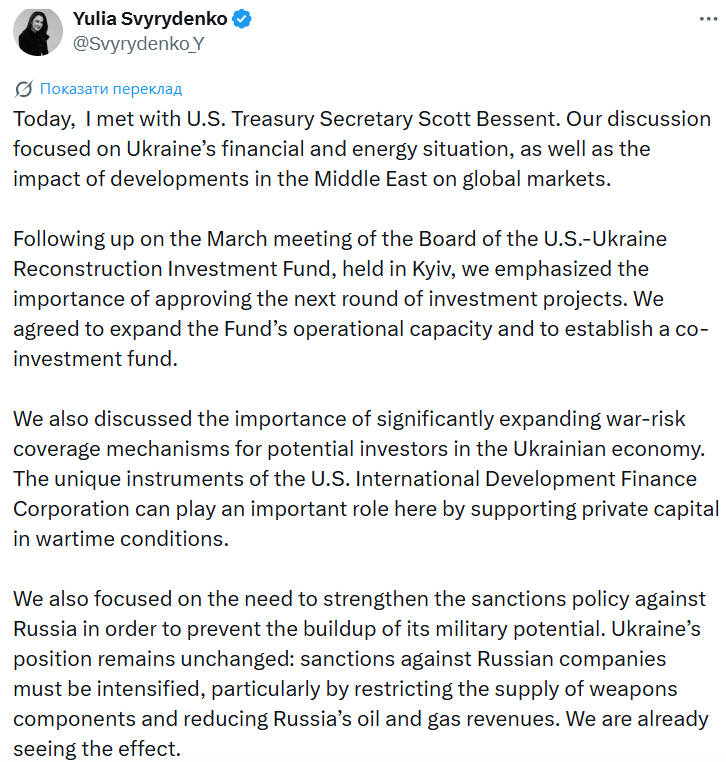 Сама Свириденко повідомила, що обговорила із Бессентом фінансову та енергетичну ситуацію в Україні, а також вплив подій на Близькому Сході на світові ринки.