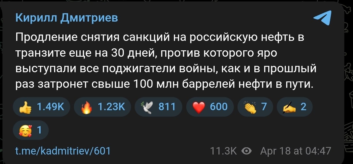 "Продовження зняття санкцій на російську нафту в транзиті ще на 30 днів, проти якого яро виступали всі палії війни, як і минулого разу торкнеться понад 100 млн барелів нафти в дорозі", - написав Дмитрієв у своєму Telegram-каналі.