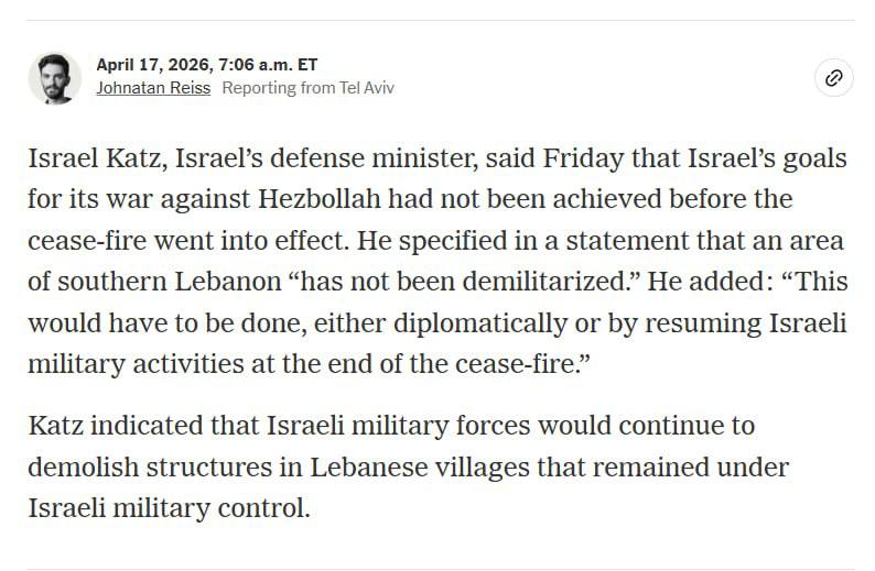 "Напередодні Кац заявив, що Ізраїль продовжить "зачистку" території під час дії режиму припинення вогню, у тому числі шляхом руйнування будівель у селах, які розташовані неподалік кордону з Ізраїлем", - пише The New York Times.