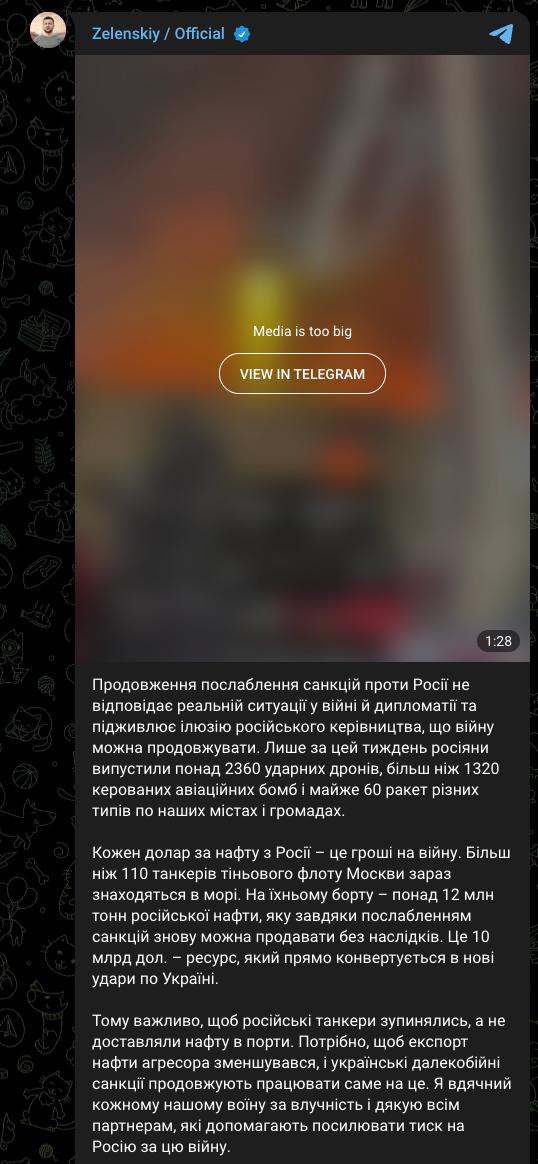 "Конвертується в удари по Україні". Зеленський розкритикував США за ослаблення санкцій проти нафти РФ