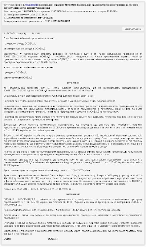 Йдеться про провадження у Голосіївському районному суді Києва за статтею про завдання легких травм. Згідно з матеріалами, на той момент він раніше не притягувався до кримінальної відповідальності.