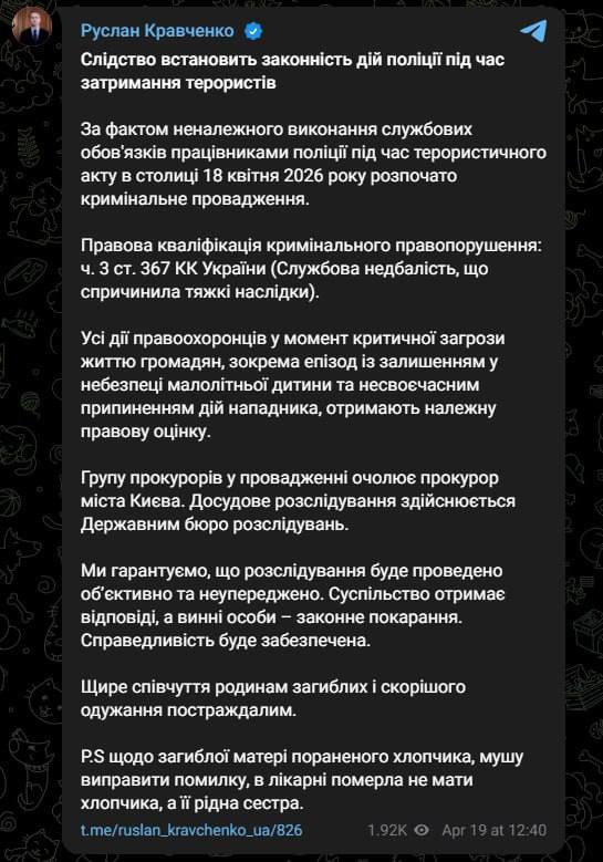"Всі дії правоохоронців у момент критичної загрози життю громадян, у тому числі епізод із залишенням у небезпеці малолітньої дитини та несвоєчасним припиненням дій нападника, отримають належну правову оцінку", - наголосив Кравченко.