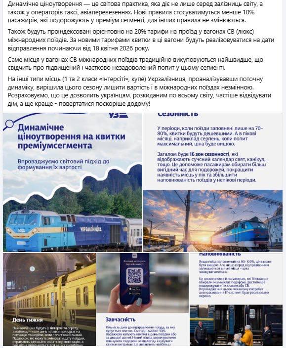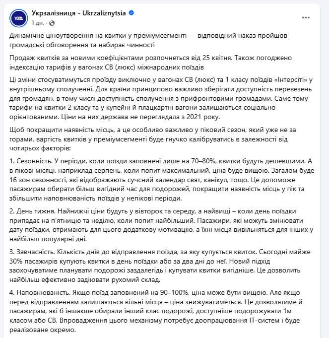 "Для країни принципово важливо зберігати доступність перевезень для громадян, у тому числі доступність сполучення з прифронтовими громадами. Саме тому тарифи на квитки 2 класу та у купейні та плацкартні вагони залишаються соціально орієнтованими", - пояснює УЗ.