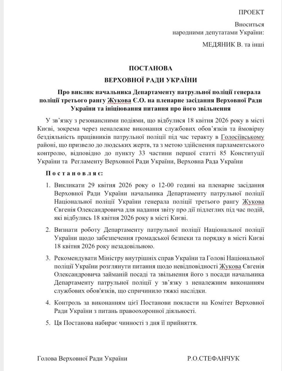 Раніше інцидент із патрульними, що втекли, не залишився поза увагою Верховної Ради - там почали збір підписів за відставку Жукова. Проект ухвали опублікував народний депутат від "Слуги народу" Максим Бужанський.