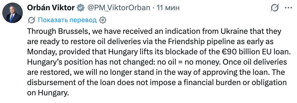 "Через Брюссель ми отримали сигнал від України про те, що вони готові відновити постачання нафти трубопроводом "Дружба" вже з понеділка за умови, що Угорщина зніме блокування кредиту ЄС на 90 мільярдів євро. Позиція Угорщини не змінилася: немає нафти - не буде грошей. Після відновлення постачання нафти ми більше не перешкоджатимемо схваленню кредиту", - написав Орбан.