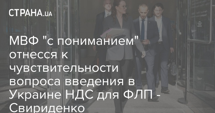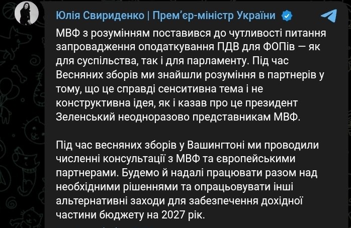 МВФ з розумінням поставився до чутливості питання запровадження в Україні ПДВ для ФОП - Свириденко
