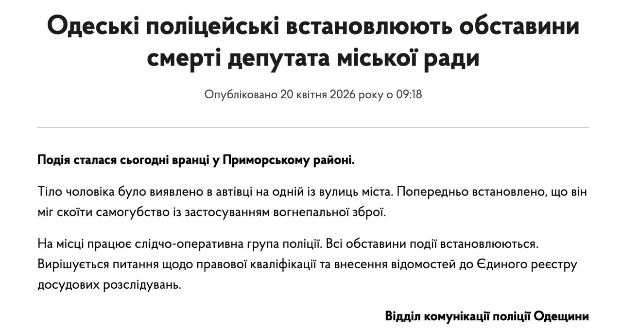 В Одесі у простріленій машині знайшли мертвим депутата міськради. Поліція розглядає версію самогубства