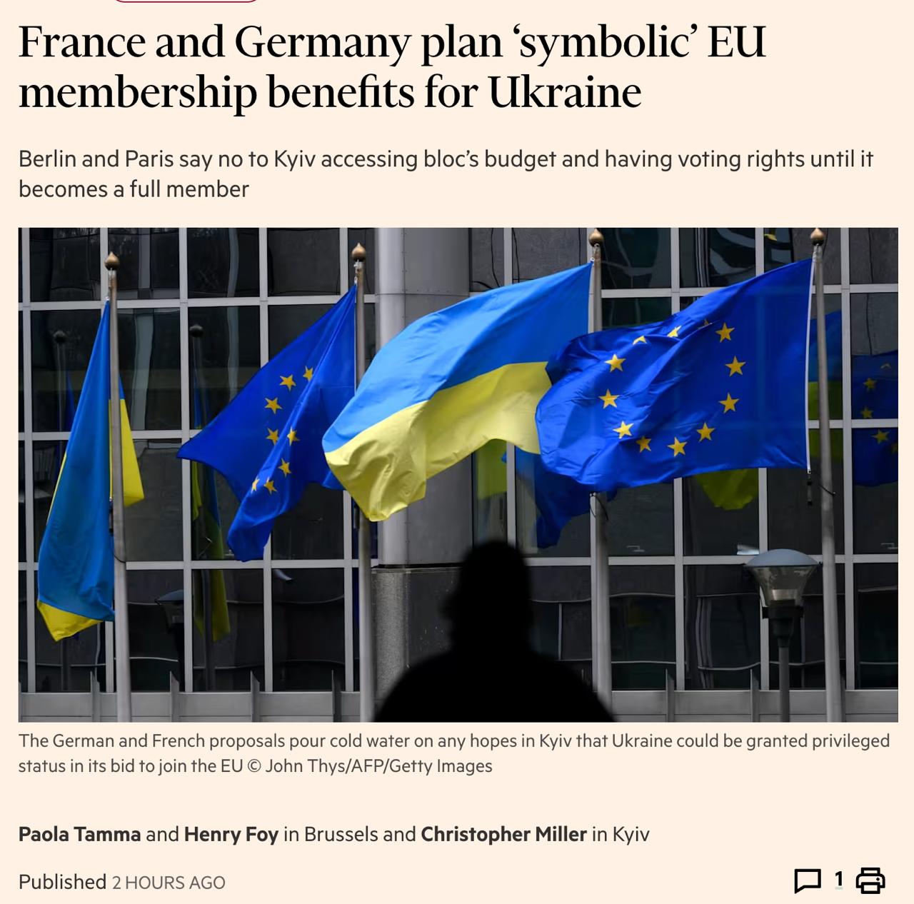 Німеччина та Франція запропонували замість прискореного членства в Європейському Союзі надати Україні символічні переваги без права голосу та без доступу до бюджету блоку.