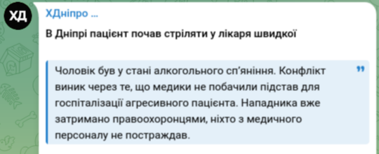 У Дніпрі п'яний місцевий житель відкрив вогонь по парамедику після того, як отримав відмову у своїй госпіталізації.