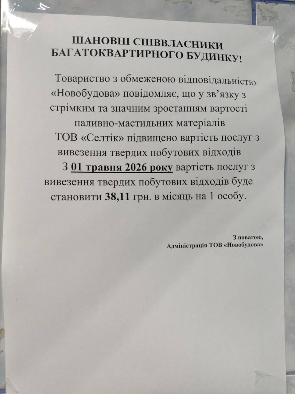 Через стрімке та суттєве подорожчання пально-мастильних матеріалів один із найбільших у Києві перевізників побутових відходів ТОВ "Селтік" заявив про підвищення з 1 травня 2026 року своїх тарифів у середньому на 15,4% — до 38,11 грн на одну особу, яка проживає в багатоквартирному будинку.