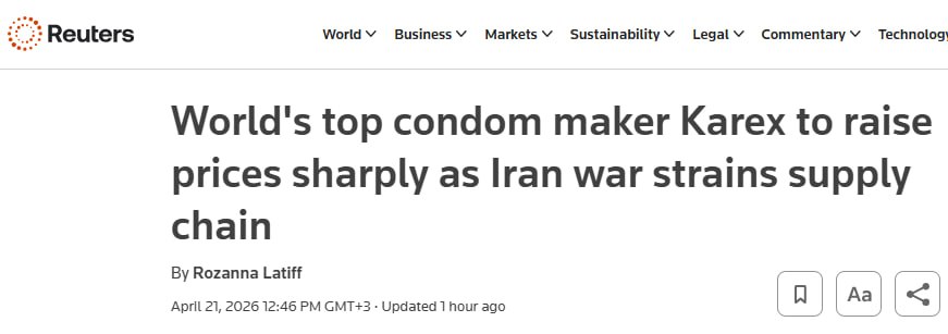 Найбільший у світі виробник презервативів - малайзійська компанія Karex Bhd - планує підвищити ціни на 20-30%, а можливо, і ще більше, якщо збої в ланцюжку поставок затягнуться через війну з Іраном, заявив гендиректор компанії Го Міа Кіат.