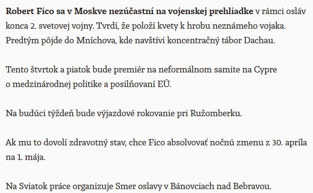 Нагадаємо, минулого року Фіцо прилетів до Москви на свято Перемоги. Його літак летів у Москву довгим південним маршрутом, що проходить через Угорщину, Румунію, Чорне море та Грузію. Маршрут змінили після того, як літаку главі словацького уряду заборонили пролітати над своєю територією Естонія, Латвія та Литва.