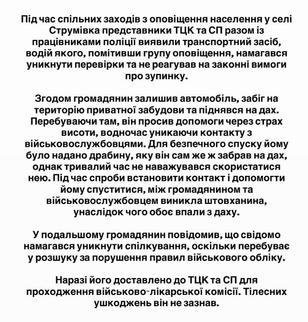 У селі Струмівка під Луцьком під час заходу щодо оповіщення військовозобов'язаних чоловік, намагаючись втекти від співробітників територіального центру комплектування, заліз на дах приватного будинку, після чого під час бійки він і військком упали з висоти.