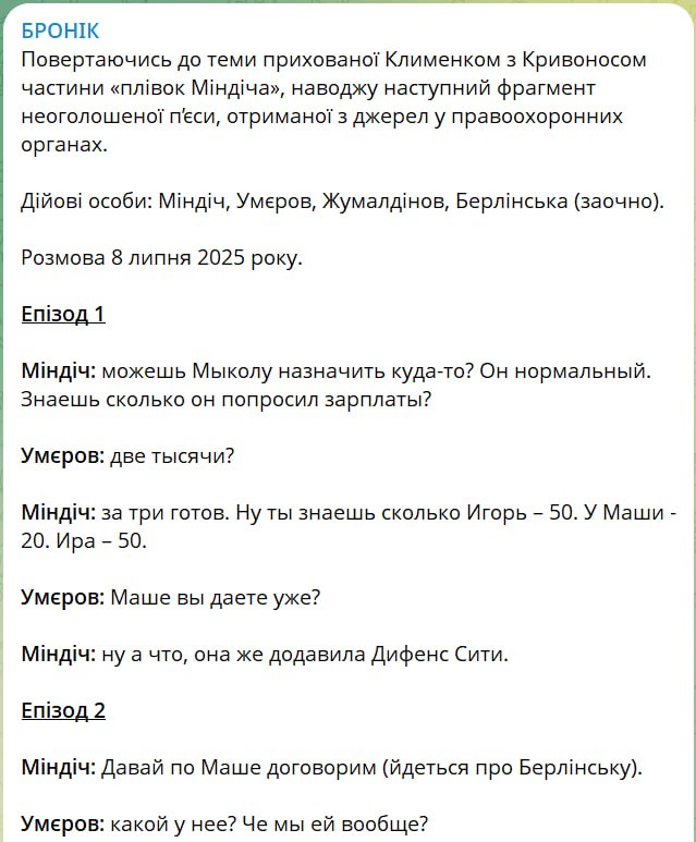 Йдеться про передбачувані діалоги Міндіча з тодішнім міністром оборони Рустемом Умеровим та головою агентства оборонних закупівель Арсеном Жумадиловим. Розмови датовані 8 липня 2025 року.