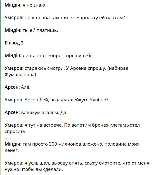 Також Міндіч каже Умерову, що він вклав 300 мільйонів доларів у бронежилети. З цього приводу міністр оборони дзвонив голові Агенції оборонних закупівель Жумаділову.
