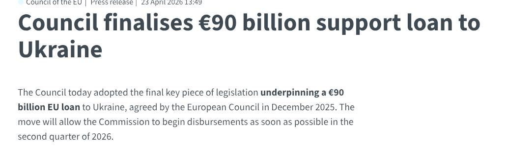 Нагадаємо, вчора Рада ЄС остаточно затвердила кредит Україні у розмірі 90 мільярдів євро, який довго не могли узгодити через позицію Угорщини.