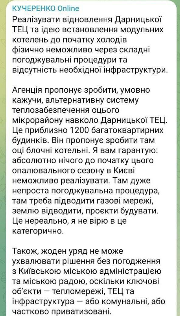 "Агентство пропонує зробити, умовно кажучи, альтернативну систему теплозабезпечення цього мікрорайону навколо Дарницької ТЕЦ. Це приблизно 1200 багатоквартирних будинків. Воно пропонує зробити там ці блокові котельні. Я вам гарантую: абсолютно нічого до початку цього опалювального сезону в Києві неможливо реалізувати. нереально, я не вірю в це категорично", - заявив Кучеренко.