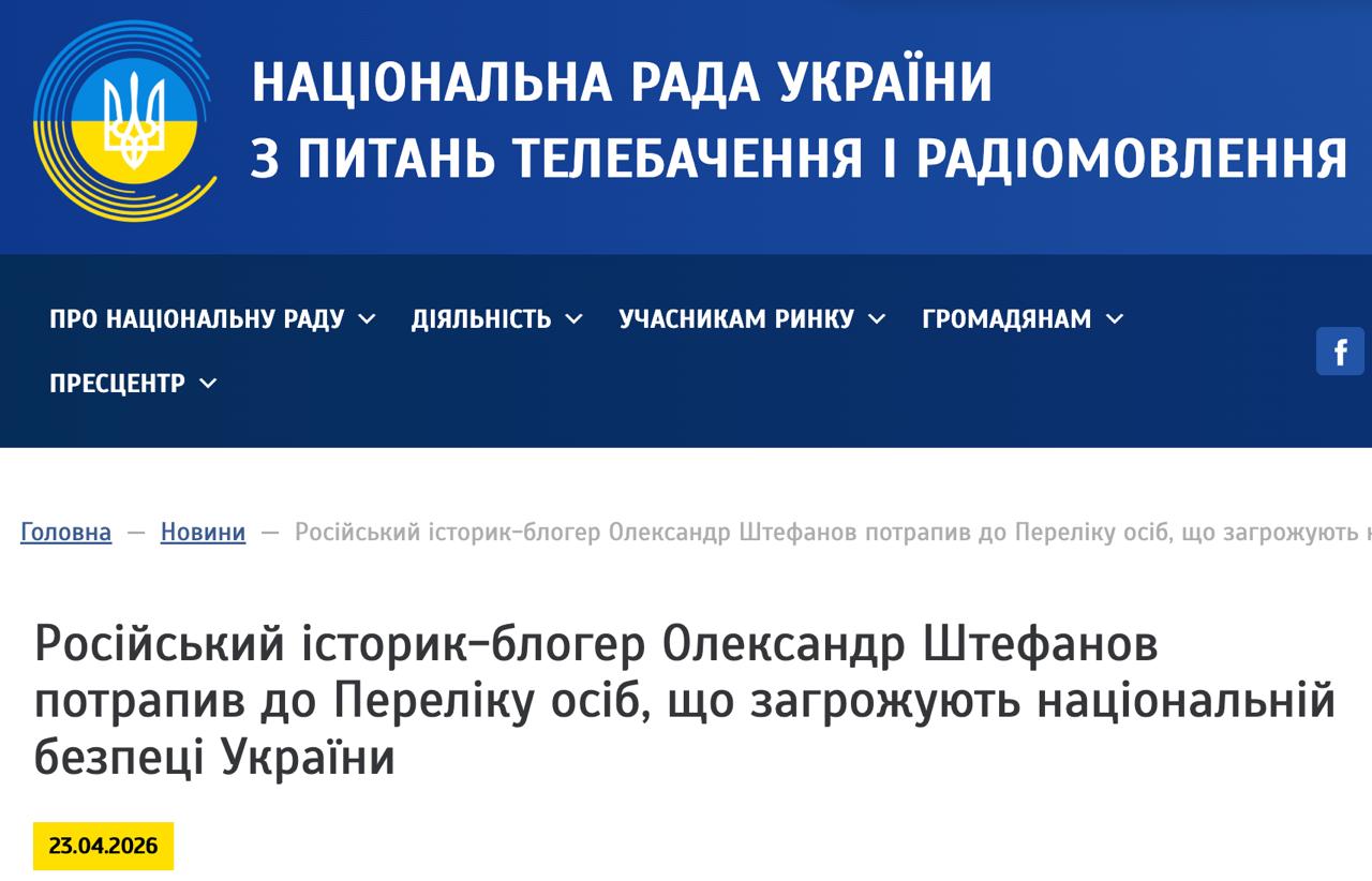 Нацрада заявила, що у матеріалах Штефанова зафіксовано "системне поширення антиукраїнських наративів. Його висловлювання спотворюють історичну правду, легітимізують акти агресії Росії та створюють реальну загрозу інформаційному суверенітету України".