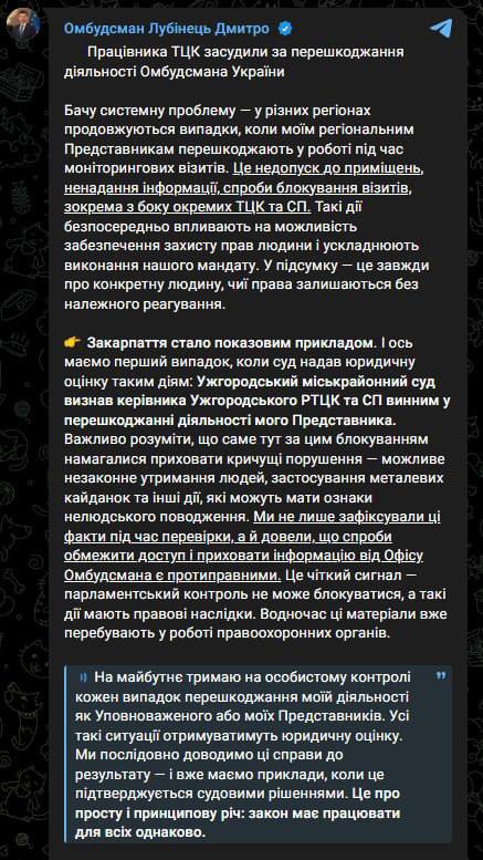 За його словами, йдеться про рішення Ужгородського міськрайонного суду, який визнав керівника Ужгородського районного ТЦК та СП винним у перешкоджанні діяльності представника омбудсмена.
