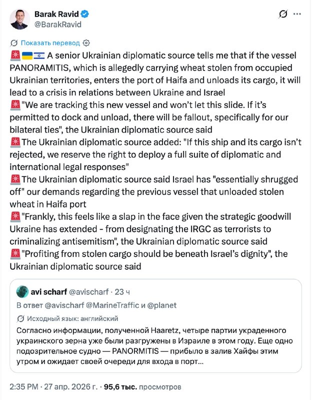 "Високопоставлене українське дипломатичне джерело повідомило мені, що якщо судно "Панормітіс", що ймовірно перевозить пшеницю, вкрадену з окупованих українських територій, увійде до порту Хайфи і розвантажить свій вантаж, це призведе до кризи у відносинах між Україною та Ізраїлем.