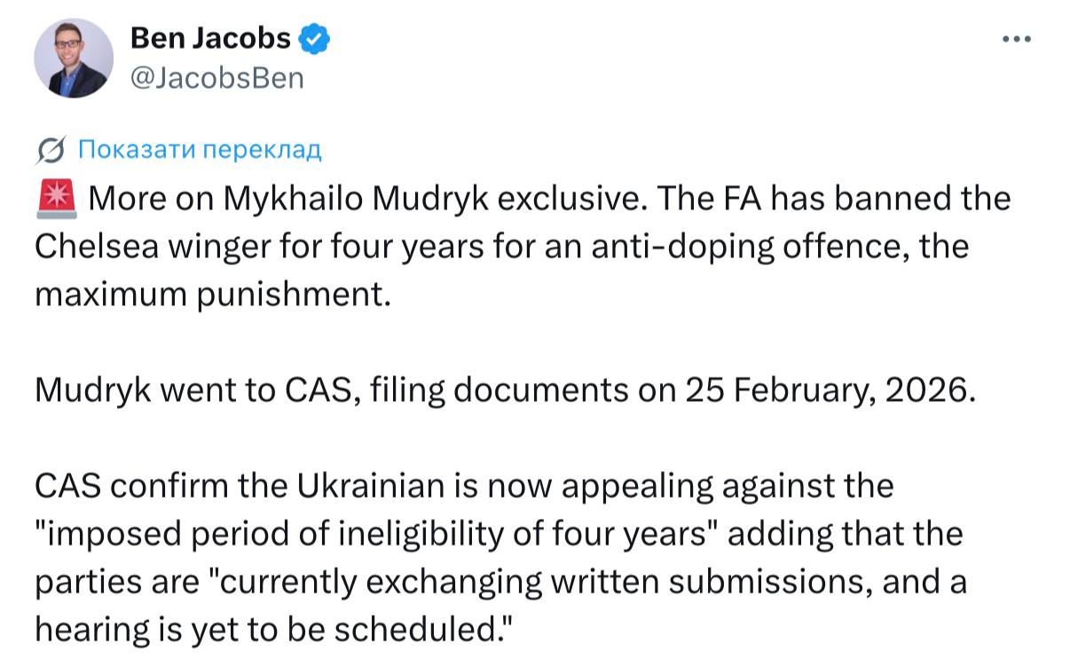 За даними журналіста, Футбольна асоціація Англії (FA) усунула півзахисника "Челсі" за порушення антидопінгових правил. Мудрик у лютому подав апеляцію до Спортивного арбітражного суду.