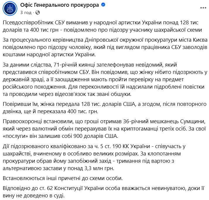 За даними слідства, підозрюваний заявив телефоном літній жінці, що СБУ підозрює її в держзраді і її заощадження потрібно перевірити на предмет російського походження. Для переконливості їй надсилали підроблені повістки та проводили через відеозв'язок "обшуки".