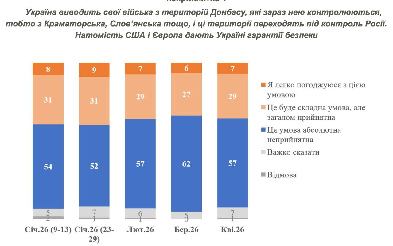 У березні виведення військ із Донбасу загалом підтримували 33%, а у квітні – вже 36%. Хоча ще у січні було 40%. Проти у березні було 62%, а стало 57%.
