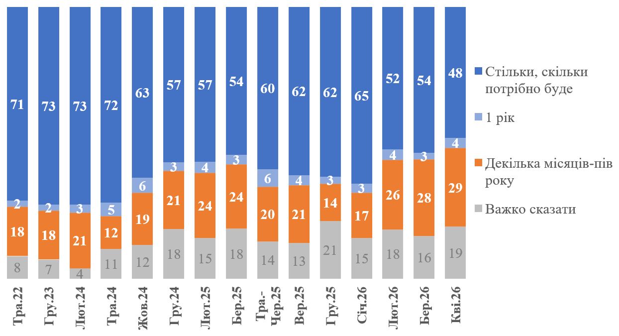 Ще 4% готові терпіти війну ще рік, 29% опитаних говорять про кілька місяців, а 19% не стали відповідати на це питання.