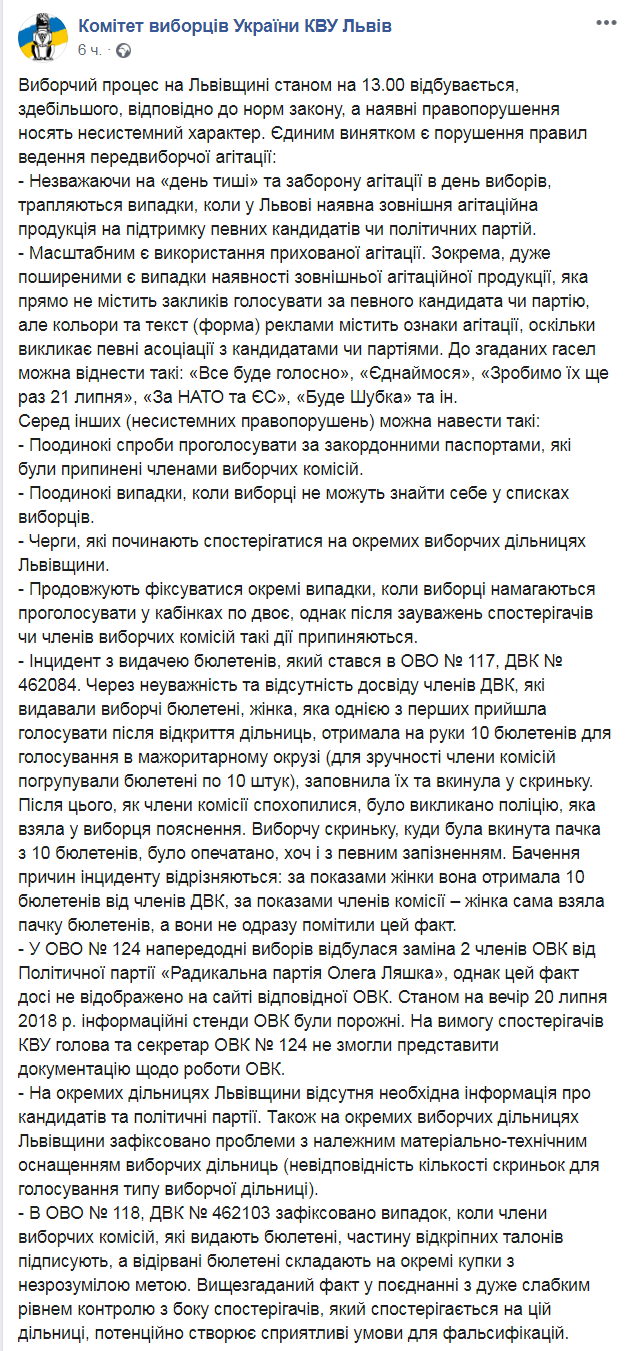 "Инцидент с выдачей бюллетеней, который произошел в ОИО № 117, УИК № 462084. Из-за невнимательности и отсутствия опыта у членов УИК, которые выдавали избирательные бюллетени, женщина, которая одной из первых пришла голосовать после открытия участков, получила на руки 10 бюллетеней для голосования в мажоритарном округе (для удобства члены комиссий сгруппировали бюллетени по 10 штук), заполнила их и сунула в ящик", - написано на Facebook Комитета избирателей Украины.